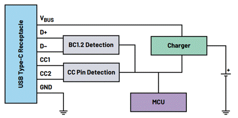 BC1.2檢測IC支持傳統的USB適配器。雖然更新的設備更廣泛地采用USB Type-C,但許多應用仍然使用舊的USB規格。BC1.2兼容端口采用D+/D-引腳來傳輸電源的功率容量,而不是CC引腳。BC1.2檢測IC讀取D+/D-引腳,為仍然使用傳統USB標準的應用配置充電。