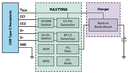 獨立PD控制器的一個示例是MAX77958(圖4)。MAX77958具有兩個獨特功能:非易失性存儲器和直接控制配套充電器的I 2 C主端口。這兩個功能消除了對外部MCU的需求,也無需開發定制固件。
