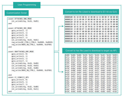定制腳本是使用簡單、易于使用的命令在GUI中編寫的。該軟件將定制腳本轉換為十六進制格式,并將其寫入IC配置區域。開發人員可以根據基于其應用需要提供的功能來定義簡單的函數和序列。