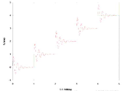 電機定子線圈的電流并不是最大電流(Fullcurrent) 或者就是沒有電流,而是一個中間的電流 值,相比于4個整步電流(4 full steps) 更接近于一個正弦波形狀。永磁體的轉子位置處在2個整步位置之間(合成磁場位置) 。最大的細分數是由驅動器的A/D和D/A能力決定。TRINAMIC所提供的驅動 和控制器可以達到256細分(8bit) 采用集成的正弦波配置表格,步進電機可以實現非常小的角度控 制,圖4描述了在達到新位置時候的波動。