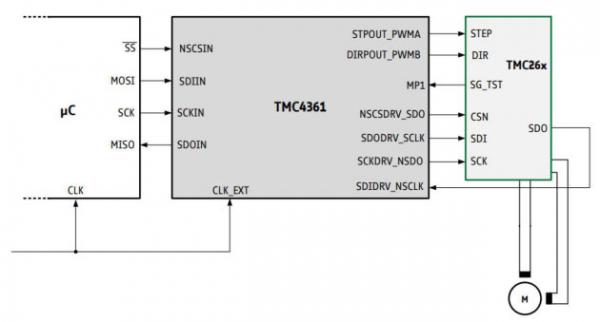 圖:TMC4361A 以 SPI 模式或者 S/D 模式連接 TMC2130 或 TMC2160 步進驅(qū)動芯片