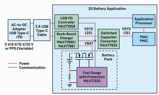 另一個考慮因素是使用大容量的電池,高耗電的終端設備需要這些電池來維持更長的運行時間。相比于1S電池,2S電池可以在不增加充電電流的情況下增大容量。由于USB-C支持5V到20V之間的輸入電壓,而2S或3S電池的電壓介于這兩者之間,因此借助降壓-升壓轉換器可以彌補這一差距。圖2給出了基于2S電池應用的方框圖。