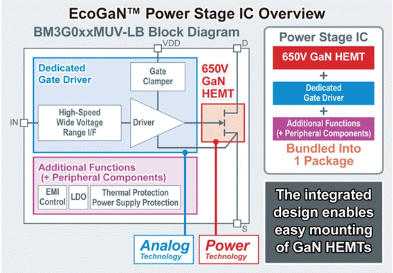 在過去的幾年里,消費者和工業部門越來越需要更多的能源節約,以實現可持續發展的社會。 雖然 GaN HEMT 有望顯著促進小型化和提高功率轉換效率,但與硅 MOSFET 相比,柵極驅動的難度較大,需要使用專用的柵極驅動器。 為此,ROHM 開發了功率級 IC,利用核心功率和模擬技術,將 GaN HEMT 和柵極驅動器集成到單個封裝中,從而大大簡化了設計與安裝。