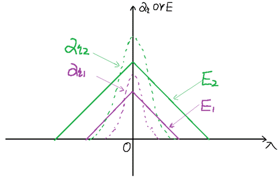 接下來(lái)我們通過(guò)舉例來(lái)看擊穿電壓VB與哪些因素相關(guān):圖[5]所示為兩種摻雜濃度材料的Ec VS Xd曲線關(guān)系(其中,N1>N2)。