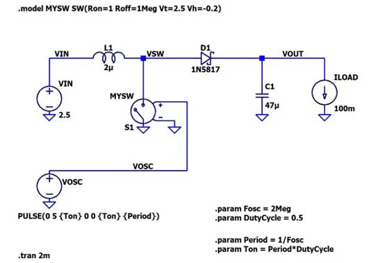 我們的 V IN = 2.5 V 和 V OUT = 5 V。由于我不會故意將非理想因素納入模擬中,因此我會將效率保留為 100%。這給我們提供了 50% 的占空比。