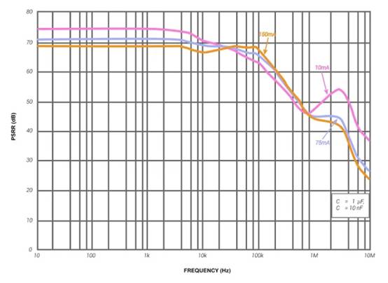 當(dāng)我們討論這個主題時,線性穩(wěn)壓器的紋波抑制能力用 PSRR(電源抑制比)來??衡量。PSRR根據(jù)多個參數(shù)波動,包括頻率;下圖(圖 3)顯示了這種波動。