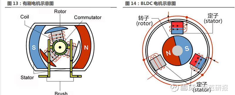 在BLDC電機直流無刷電機線圈在定子上轉子是永磁體通過改變周圍的線圈所產生的磁場的方向使轉子旋轉通過控制通向線圈的電流方向和大小來控制轉子的旋轉由于無需向轉子通電所以無需電刷與有刷電機相比BLDC電機效率高控制性好運轉過程中噪音小且不產生火花成本相對也更高