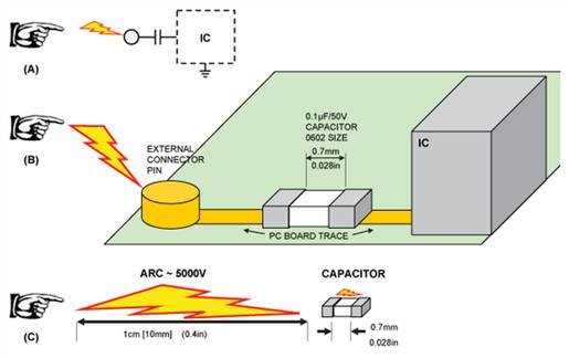 在制造過程中構建 IC 是容易發生 EOS 和 ESD 損壞的地方。圖 1A 顯示了 PCB 示意圖。我們可能會認為IC是受到串聯電容的保護。不是這種情況。第二個損壞機會是當客戶將 IC 安裝在 PCB 上以構建產品時。仔細觀察圖 1B,我們發現電容器的工作電壓為 50 V,但兩個金屬端連接之間的距離僅為 0.28 英寸(7 毫米)。由于火花僅跳躍 0.4 英寸(1 厘米),因此電容器周圍的小間隙很容易受到損害。結果可能是 IC 付出了生命的代價(圖 1C)。,當客戶在其環境中操作產品時,可能會發生 EOS 或 ESD 損壞。