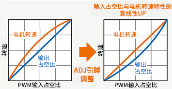 風阻損耗是旋轉部分與空氣等之間的摩擦阻力造成的損耗。例如,在風扇電機中,由于電機的特性,即使與輸入占空比相對的輸出占空比為直線,中間占空比附近的轉速也可能會升高。通過ADJ引腳對輸出占空比的直線性進行調整,可提高電機轉速的直線性,并可提高速度設置精度。