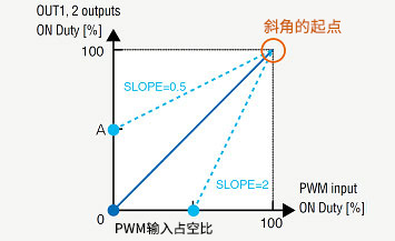 搭載了可通過SLOP引腳對PWM輸入占空比和輸出占空比的斜率特性進行設置的功能。這是對輸入和電機轉速的特性進行調整時使用的非常方便的功能。可在0.5~2之間對輸出占空比的斜率進行調整。下圖為PWM輸入的示例。