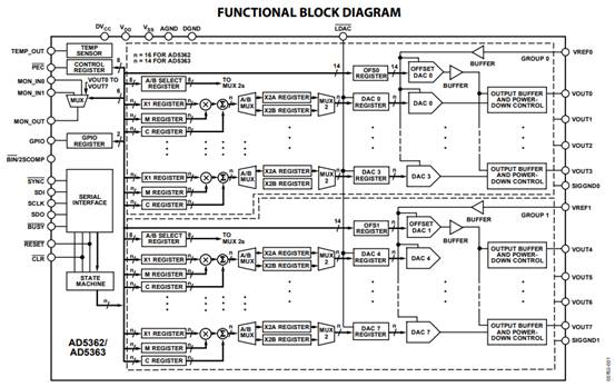下圖(圖1)為AD5362內部框圖,它是一款集成8通道16位的DAC,它提供的緩沖電壓輸出范圍為基準電壓源的4倍,各DAC的增益和失調可以獨立進行調整,以消除誤差。該器件分成兩組,每組4個DAC,具有更高的靈活性,且每組的輸出范圍可單獨通過一個偏移DAC調節。