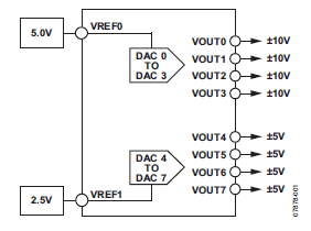 根據AD5362的描述,我們了解到器件內部DAC0-DAC3使用一個基準源VREF0,DAC4-DAC7使用另外一個基準源VREF1,所以可以利用不同的基準電壓值來實現不同的DAC輸出范圍,如下圖(圖2)所示: