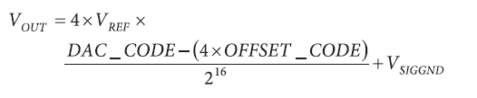 在使用2.5V電壓基準的時候,±5V標稱輸出可以發生偏移,產生−10V至 0V或0V至+10V輸出。但是使用5V基準電壓時,產生±10V標稱輸出,卻無法利用偏移DAC寄存器產生0V至+20V輸出,因為這超出了電源和裕量限制。DAC輸出電壓由以下公式決定,值得注意的是OFFSET寄存器是14位的,AD5362本身是16位的,所以需要將OFFSET_CODE乘以4。VSIGGND為相關SIGGND引腳上的電壓,通常為0V。