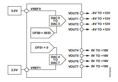 AD5362內部有兩個OFFSET寄存器:OFS0和OFS1。OFS0控制DAC 0至DAC 3的偏移,OFS1控制DAC 4至DAC 7的偏移。AD5362內部偏移DAC是14位的且默認值為0X2000,也就是8,192,跨度為基準電壓值的四倍。用戶理論上最多可以將輸出范圍上移或下移10V,不過輸出只能在電源和裕量要求的限制范圍內調整。
