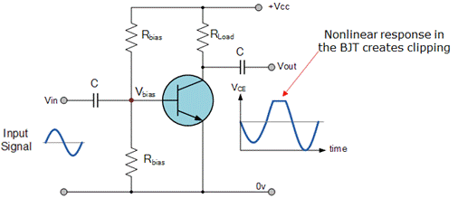 在推挽式晶體管放大器中,特別是在使用三極管(Bipolar Junction Transistor,BJT)的放大器中,信號可能會出現交叉失真。當一對晶體管中有一個進入截止區時,輸出信號會短暫降至零,此時就會發生交叉失真。實際上,當輸入信號處于低電平時,放大器中的兩個晶體管都沒有開啟,因此即使輸入信號不為零,輸出信號也為零。下面是一個簡單的時域示例。