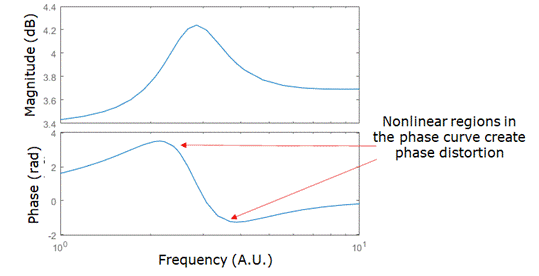 當濾波器的傳遞函數(伯德圖)的相位是頻率的非線性函數時,濾波器就會產生相位失真。此時輸出波形會出現失真,但不一定是因為波形出現了削波或其他幅值效應,而是因為群速度和相速度不是恒定值,因此組成信號的不同頻率會以不同的速度傳播。