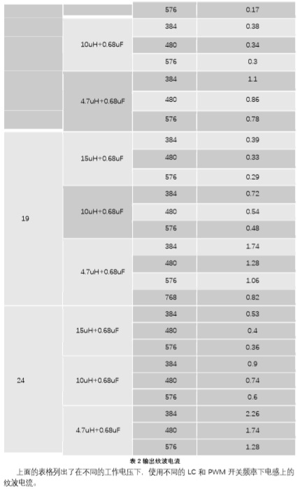 上面的表格列出了在不同的工作電壓下,使用不同的LC和PWM開關(guān)頻率下電感上的紋波電流。