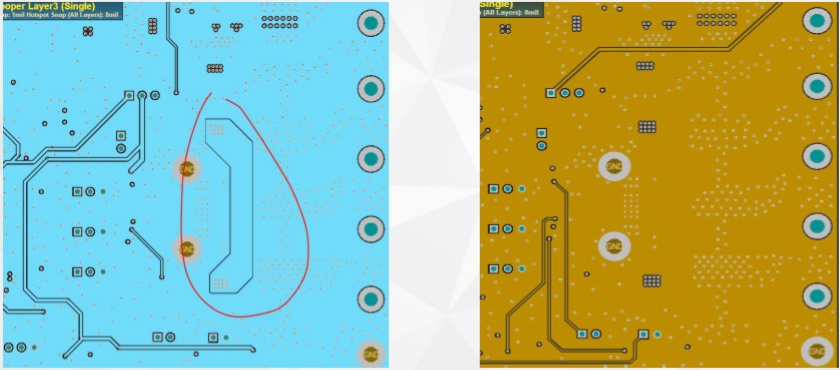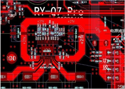 2) 在大信號播放時,功放芯片通過引 腳和底部散熱片向PCB散熱,由于周邊銅皮被切割成孤島,影響熱量傳導,長時間后芯片過熱保護.