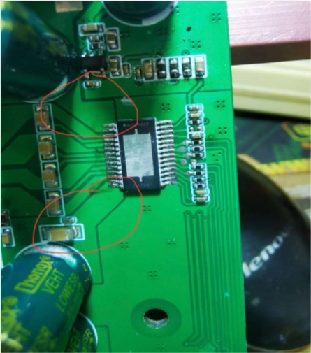1)陶瓷貼片濾波電容擺放離芯片PVDD管腳太遠,導致功放芯片啟動就 產生過流保護.