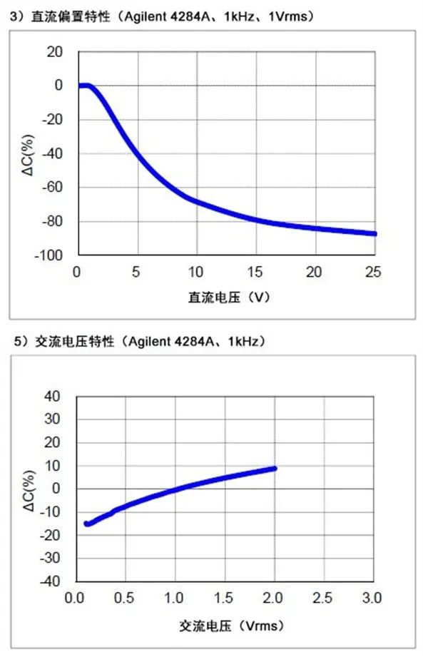 測試信號 : 舉例而言,下圖摘自 CL31A106KAHNNNE 特性表 ,展示了直流偏置和交流測試信號振幅對觀測的電容值產生的影響。在這種情況下,稍微改變交流電測試信號的振幅,就會導致觀測的電容值出現 -15% 到 +10% 之間的浮動。而直流偏置造成的影響更大;在僅有四分之一的額定電壓的情況下,設備的電容會降低一半。對于那些認為所有偏差都不會超出標稱的 +/-10% 容差值的人來說,這可能會讓他們大吃一驚。
