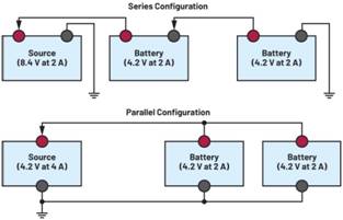 在電池管理系統中,有幾種電池配置方法,可分別實現不同的結果。一種配置方法是將電池進行串聯,以提高電壓,但電池容量保持不變,這通常適用于高功率產品。另一種配置方法是將電池進行并聯,這會提高容量,但電壓保持不變。現在,延長電池壽命對消費電子設備如此關鍵,這促使制造商尋求創新方法來保存和擴展電池組的有用容量。延長電池壽命簡單有效的方法是并聯充電。簡而言之,通過并聯充電電池,用戶可以一次為多個電池充電,從而實現更長的電池壽命并提高可靠性。圖1簡單描述了常用的串聯和并聯電池配置。