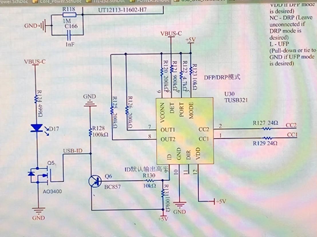 Type-C接口的方案是需要芯片來檢測U盤等設備的正反插,所以就用到了TUSB321芯片來檢測CC腳的變化,然后產(chǎn)生一個ID的信號給BQ25896(電路如下圖),這款芯片也有個ID識別腳一但識別到TUSB321給的信號之后,就會產(chǎn)生一個反向輸出電壓給外部設備供電。