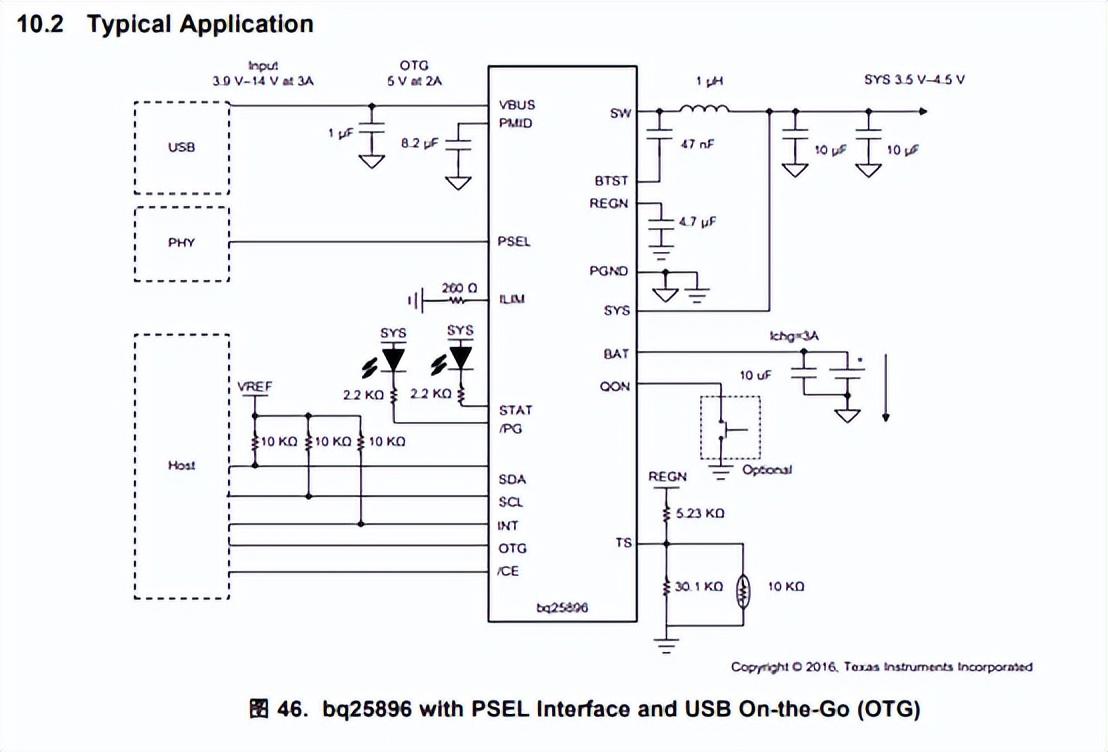最后插上仿真線去檢測插上外部設備的瞬間是否有狀態(tài)的跳變,當我們這樣去檢測的時候發(fā)現(xiàn)BQ25896出現(xiàn)了問題,它主動報電流過大的錯誤導致關斷。因為這款芯片的功能很豐富短路保護、過流保護、過溫保護等,因為我們的一些外部條件出發(fā)了它的保護機制,所以才會出現(xiàn)這種輸出突然又中斷的現(xiàn)象,找到原因我們就分析從哪部分開始著手整改,首先是更換其他型號的U盤來排除是否是不同廠家U盤的功耗問題,然而更換了幾個U盤之后發(fā)現(xiàn)還是同樣的現(xiàn)象,這又讓人頭疼起來了難道報錯誤的地方不是因為外部設備功耗導致的?既然不是U盤問題那只能從這款芯片下手了,TUSB321畢竟只是檢測個狀態(tài)并不會影響太多,然后重新仔細的閱讀了下BQ25896的數(shù)據(jù)手冊,對比了下他的推薦電路和我們設計的電路有什么差別,發(fā)現(xiàn)了細微的不同。