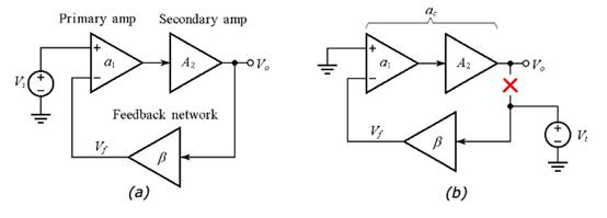 圖 1.  (a) 復合電壓放大器的框圖。(b) 求出復合放大器的開環增益 a c和噪聲增益 1/β 的電路。