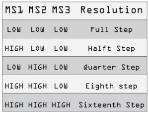 MS1, MS2 和 MS3針腳用于微步設置,如上圖所示。ENABLE針腳用于打開和關閉場效應管的輸出,低電平打開,高電平關閉。