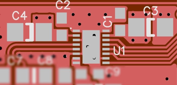 上圖所示為 IC (U1) 和四個電容器(C1、C2、C3、C4)的銅焊盤。C1和C2是用于高頻干擾的去耦電容器。根據數據表建議將 C3 和 C4 添加到電路中。由于其他平面的限制,過孔放置并不理想。