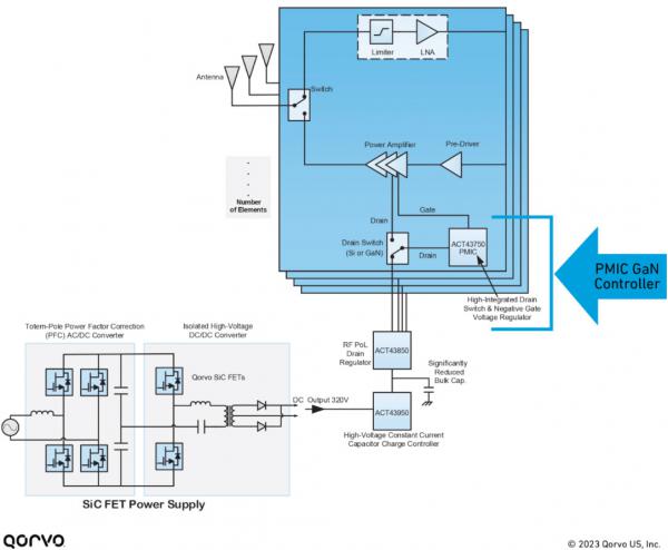 在上文中,ACT43750調節柵極和漏極——漏極電壓范圍為10至55V。需要注意的是,如果您的系統設計已經實施了電壓軌,ACT43750也可獨立使用。在這種情況下,需要添加ACT43750和開關(GaN或Si)。系統中的ACT43750單獨為RF系統的GaN器件提供10至55V直流恒定軌(適合此電壓范圍的GaN功率放大器有:QPD0005M、QPA0017和QPA2612,其它產品請訪問qorvo.com/products/amplifiers/power-amplifiers)。但是,如不添加ACT43950和ACT43850,您的設計將需要更大的功率元件與導線,如上所述。