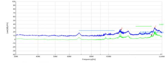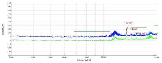 從上面的數據中可以看到,出現了10MHz間隔的頻率點,并且在154MHz頻點處超標。