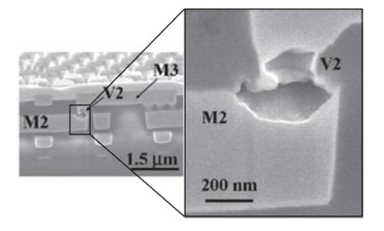 圖 1 顯示了 M2 和 M3 層之間通孔電遷移失敗的顯微照片(Christiansen 等人)。