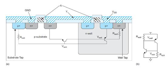 閂鎖是 CMOS 芯片中發生的一種短路現象。CMOS 傾向于在 V DD和 GND之間形成低電阻路徑,從而導致嚴重熔毀并增加 IC 的故障率。理論上,當由襯底、阱和擴散形成的寄生雙極晶體管導通時,就會發生閂鎖。