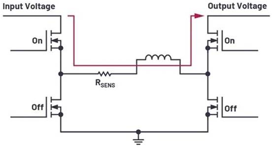 圖2所示為配有直通模式的新 LT8210 降壓-升壓控制器電路的功率級。在這種模式下,H橋的兩個高端開關(guān)永久開啟,兩個低端開關(guān)永久關(guān)閉。通過這種方式,根據(jù)電流和電壓情況,可以實現(xiàn)近乎100%的效率。