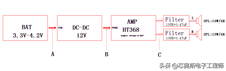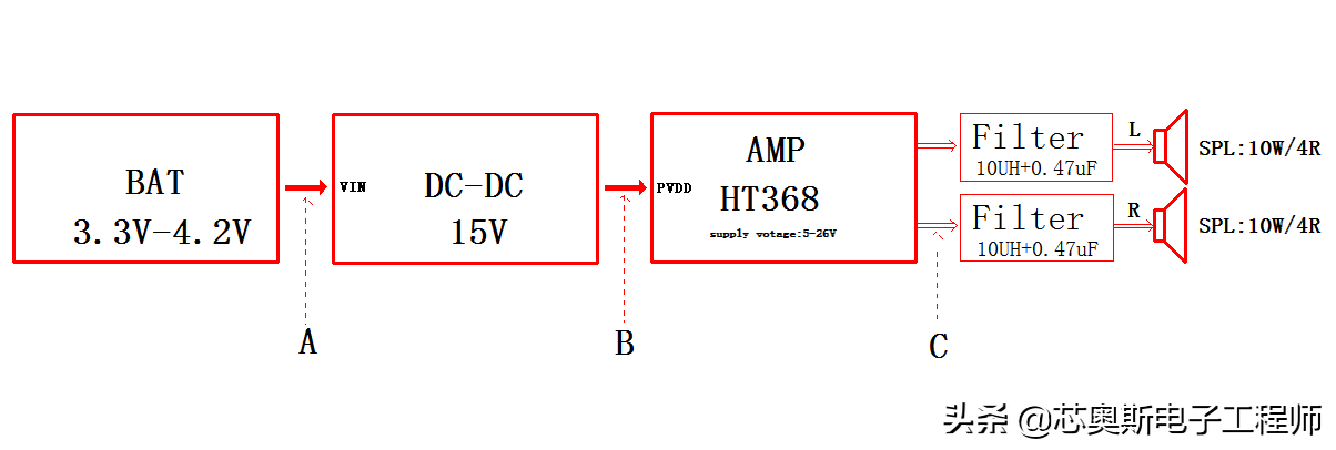 3). DC-DC輸出端的電解電容耐壓值應(yīng)該選取25V,包括功放供電腳的電容也一樣;