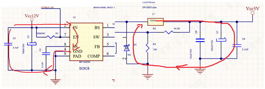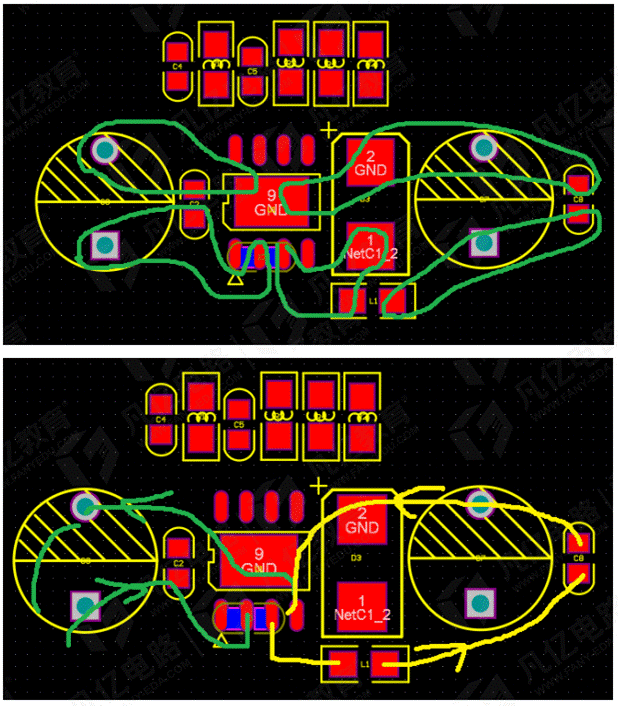 2.首先需要分析電源的輸入輸出以及續流回路,這三個回路越小越好,,因為每一個電流環都可以看成是一個環路天線,會產生輻射,會引起EMI問題,也會干擾板上其它的電路,而輻射的大小與環路面積呈正比。