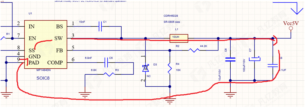16.反饋線需要連接到最后一個濾波電容后方,注意不要經過大電流的功率平面