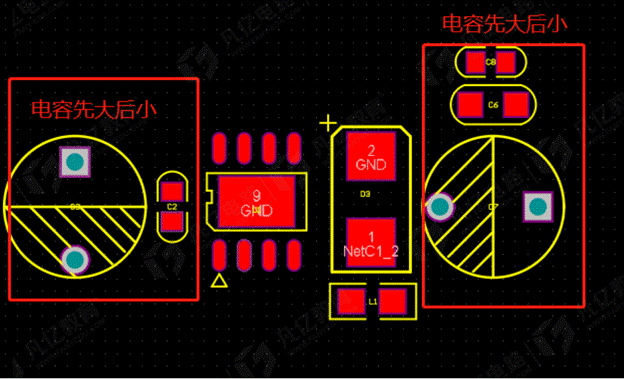 5.濾波器件需合理放置時,濾波電容在電源路徑上保持先大后小原則。