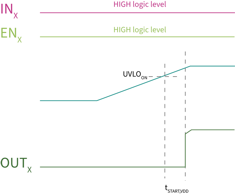 在系統啟動過程中,或從欠壓狀態恢復時,驅動器從UVLO狀態恢復所需時間tSTART至關重要。事實上,當系統從UVLO狀態恢復時,MCU和柵極驅動IC有不同的電源,MCU會在UVLO解除之前向驅動器發送PWM脈沖。在這種情況下,在驅動器電源電壓升至高于閾值(UVLOON)之前,可能會部分或完全丟失幾個脈沖。