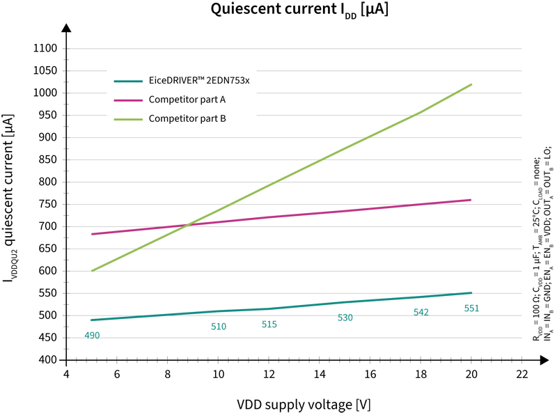 與市場上的類似IC相比,新EiceDRIVERTM 2EDN系列提供了所有所述的改進功能,同時保持較低的靜態電流,如圖8所示。這有助于降低待機狀態下的整體靜態電流消耗,以防在未施加PWM信號的情況下啟用驅動器。