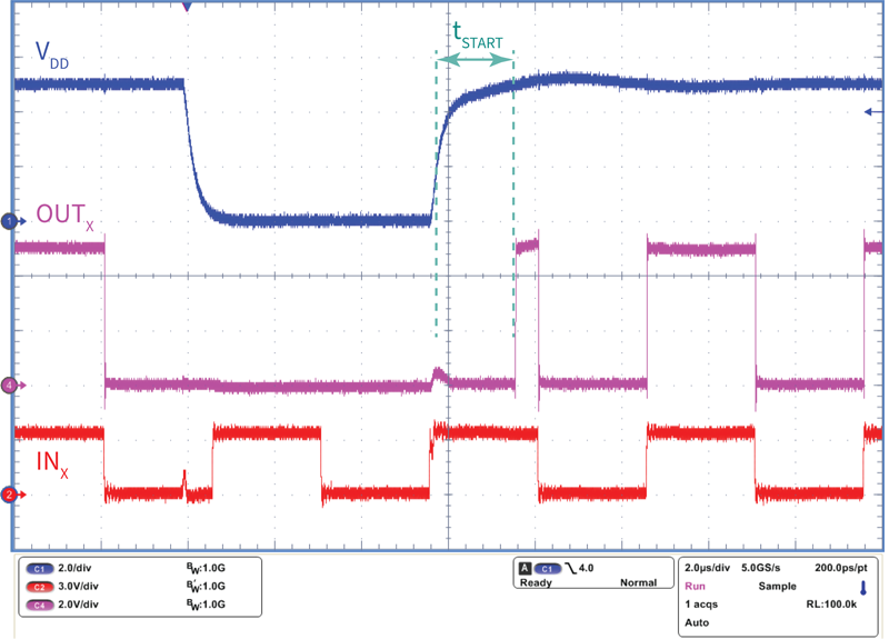 市場上大多數柵極驅動IC的UVLO啟動時間為5µs或更長。全新EiceDRIVERTM 2EDN柵極驅動IC的UVLO啟動時間(tSTART)為1.8µs(典型值),因此,在解除UVLO時僅丟失最少數量PWM脈沖,從而實現安全的轉換器啟動和可靠運行。圖7所示為UVLO恢復過程中的tSTART實測數據。