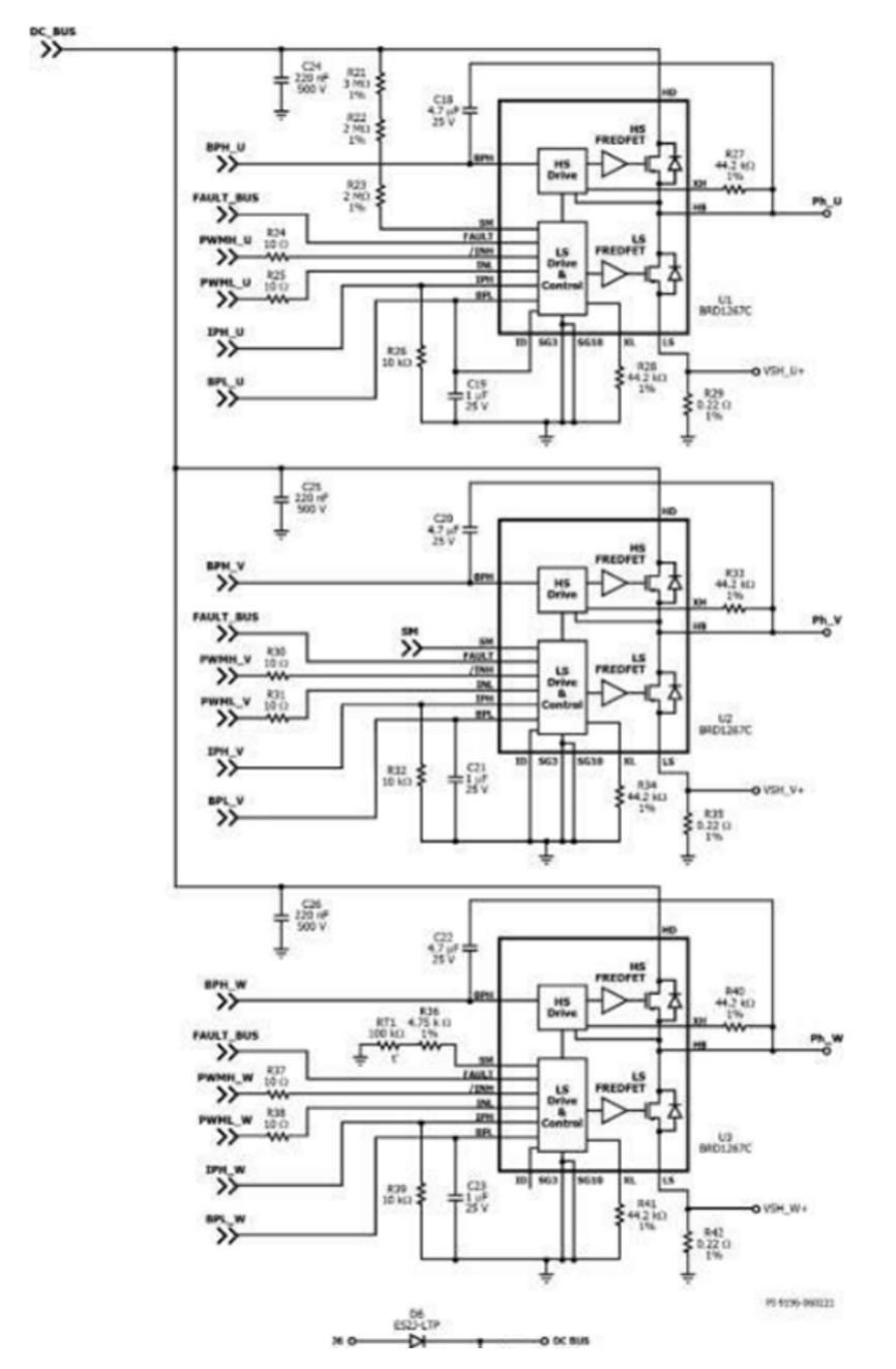 該評估板使用三顆BridgeSwitch™ BRD1267C 半橋器件,原理圖如下所示