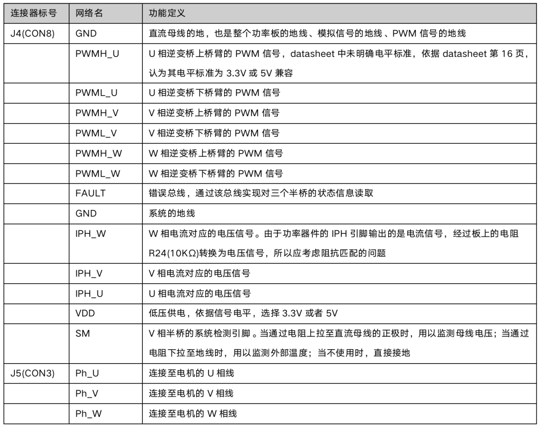 此外,該評估板的關鍵電信號主要包括:半橋功率器件,相電流與電流信號的對應關系為400uA/A,電流信號轉電壓信號所使用的電阻值為10KΩ,對應電壓信號為4V/A,該半橋最大輸出電流為0.7A,對應最大輸出電壓為2.8V;半橋的上橋臂使用的PWM信號為低邏輯,即當該PWM信號為低時,對應上的上橋臂導通;器件ID,逆變橋使用三個半橋功率器件,該三個半橋使用同一根FAULT_BUS信號與微控制器通信,因此需要設置每個半橋的通信識別ID,通過將半橋功率器件的ID引腳分別:連接至BPL引腳、懸空、連接SG引腳共三種方式來設置三個ID,微控制器具有默認的ID,因此無需設置。