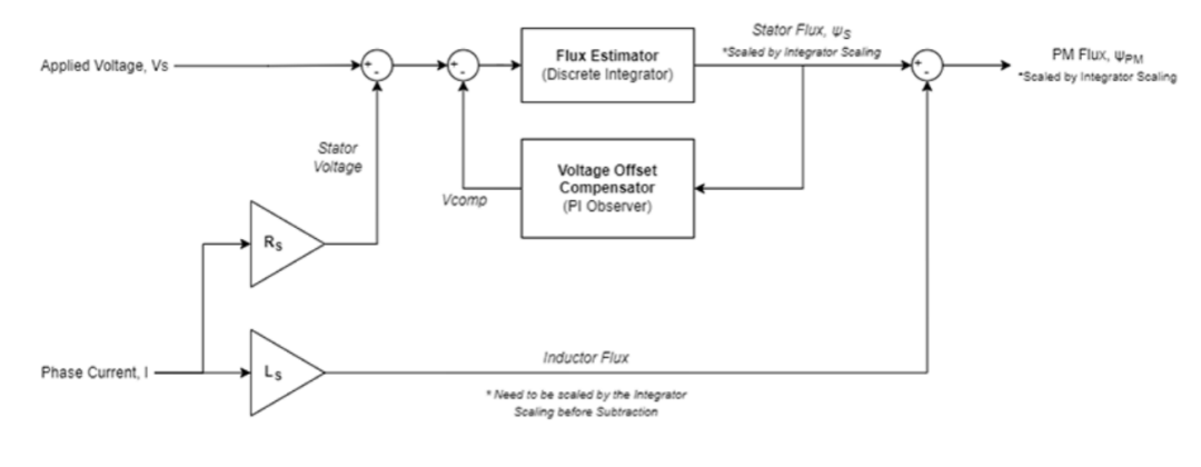 磁鏈觀測器原理如下圖所示。Vs即控制器的輸出電壓,減去電機電流×電機電阻,理想情況下,為電機的反電動勢+電機電感的電壓,通過該電壓計算得到總的磁鏈,并減去由電流+電感產生的磁鏈,即可得到電機轉子的磁鏈。由此可以看出,當電機轉速過小,將導致反電動勢過小,信噪比過小,影響觀測效果。同時可以看出,電機電感、電阻、永磁體磁鏈等參數也將影響觀測器的結果的準確性。