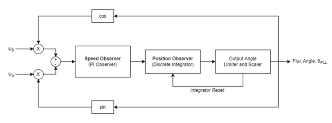 理論上,當得到轉子的磁鏈矢量時,即可通過arctan()函數計算出電機轉子位置,但是實際中此方法計算得到的電機角度紋波毛刺過大,后需一個低通濾波器。此電機控制庫使用正交鎖相環QPLL對磁鏈矢量進行處理,即可得到低毛刺的轉子位置信號。