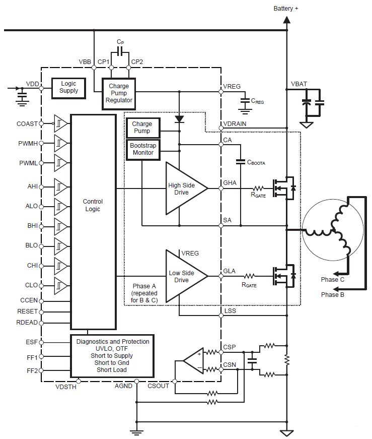 該器件可實現對三相橋中所有六個功率 FET 的全面控制,從而可通過塊整流或正弦激勵驅動電動機。集成交叉控制與電阻可調無感時間可使功率 FET 免于擊穿。