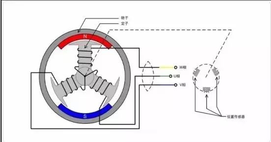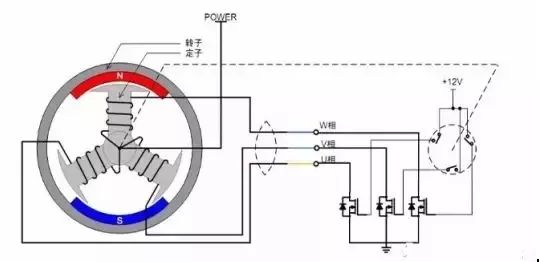 無刷直流電機的定子是線圈繞組電樞,轉子是永磁體。如果只給電機通以固定的直流電流,則電機只能產生不變的磁場,電機不能轉動起來,只有實時檢測電機轉子的位置,再根據轉子的位置給電機的不同相通以對應的電流,使定子產生方向均勻變化的旋轉磁場,電機才可以跟著磁場轉動起來。