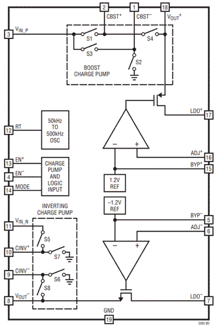 圖2 - ADI LTC3265的內(nèi)部看是電荷泵架構(gòu)+LDO架構(gòu),實現(xiàn)了穩(wěn)定的正、負(fù)電源輸出。