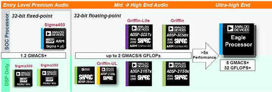 眾所周知,ADI在音頻的DSP上相當有競爭力,從其Sigma到Sharc 類的DSP均用到了各類的音頻電子產品中。如下圖(圖10)所示為ADI SigmaDSP產品選型對比表: